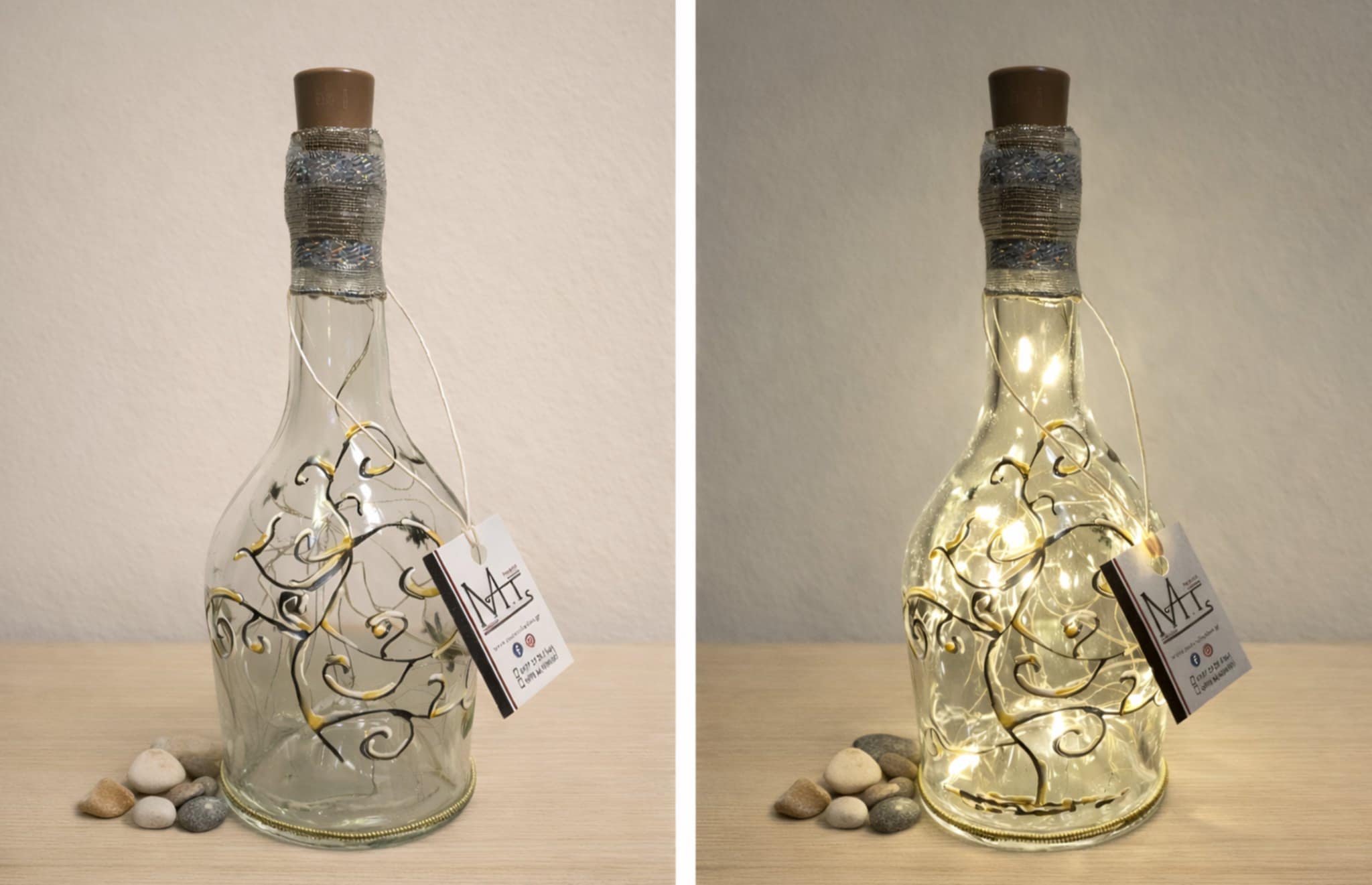 Γυάλινο μπουκάλι ζωγραφισμένο και διακοσμημένο στο χέρι με φωτάκια Led- Tree